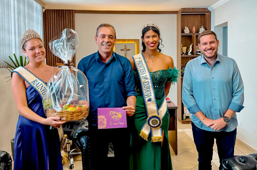 O prefeito Rodolfo Braga e o vice-prefeito João Paulo de Souza receberam, nesta segunda-feira (8), em seu gabinete, a corte da 18ª Expo Uva de Itupeva. Durante a visita, a rainha e a primeira princesa da festa entregaram o convite oficial do evento, acompanhado de uma cesta de frutas produzidas na região.