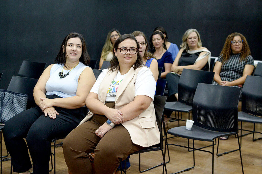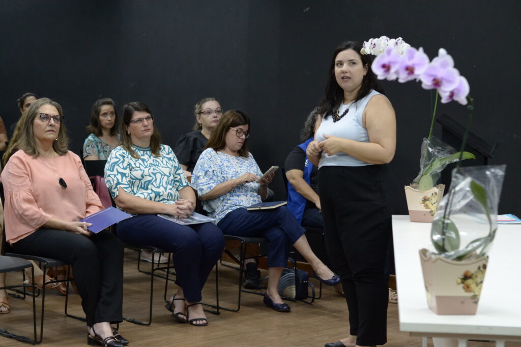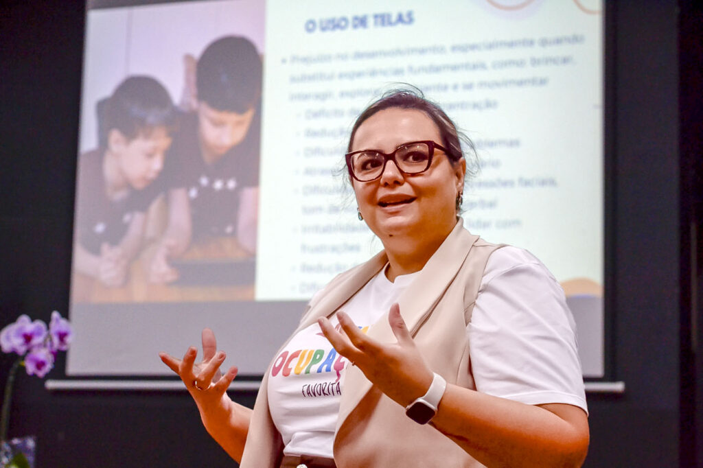 Outro ponto abordado durante o encontro foram os impactos do uso excessivo de telas na infância. Entre os principais prejuízos estão dificuldades de atenção, redução da criatividade, problemas na interação social e atrasos no desenvolvimento da linguagem, o que reforça a importância de experiências reais, interativas e afetivas.